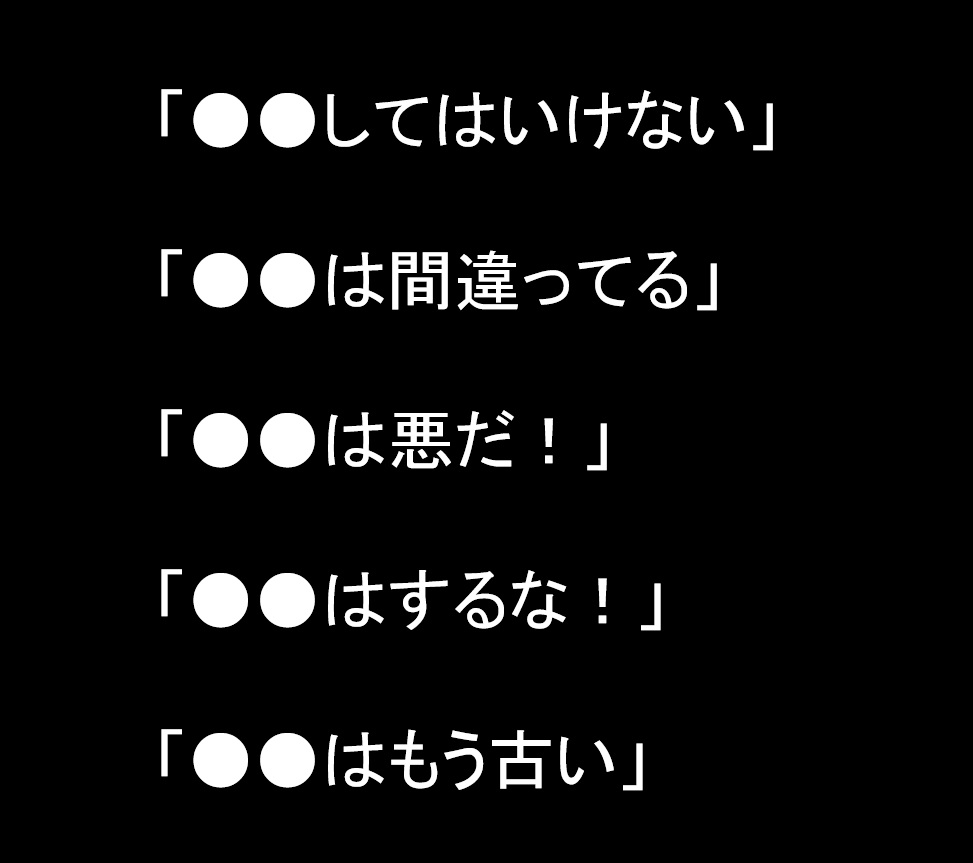 「●●してはいけない」 「●●は間違ってる」 「●●は悪だ!」 「●●はするな!」 「●●はもう古い」 などな