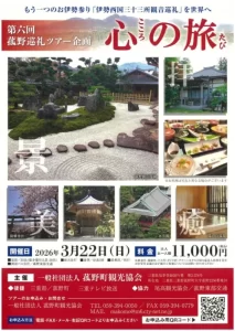 菰野町観光協会は、2026年3月22日(日)に国登録有形文化財「横山邸園」や伊勢西国三十三所観音霊場札所を巡る歴史探訪ツアー「心の旅」を開催します。普段は非公開の貴重な文化財や歴史ある建物の見学、旅館寿亭での昼食と「水雲閣」の特別見学が含まれる、菰野町の歴史と文化を深く体験できる機会です。