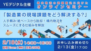 株式会社YEデジタルが主催し、株式会社インフォセンスが講演を行うオンラインセミナーが開催されます。製造業の構内物流における人手頼みや紙ベースの運用からの脱却を目指し、MES・WMS・WESの連携による改善策と具体的な事例が紹介されます。